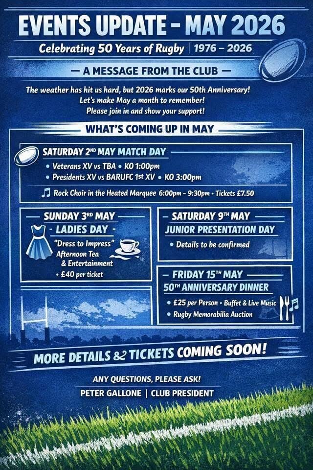 On Friday 15th May, we are hosting a commemorative dinner to mark our 50th Anniversary. This landmark event is a celebration of the history, achievements, and community that have shaped the club over the last five decades. We look forward to welcoming players, members, and supporters—past and present—for a memorable evening.
